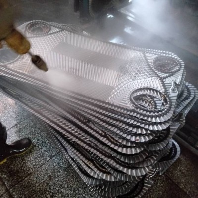 02手工拆卸清洗法:首先根據(jù)換熱器生產(chǎn)商的拆卸方法卸下?lián)Q熱器片,用毛刷或高壓水槍將換熱器片上浮銹的污垢用清水盡量沖洗干凈【以減少藥劑的消耗 量】,然后將換熱器片浸泡在存有藥劑劑的塑料容器內(nèi),浸泡時間不少于30分鐘,由于浸泡次數(shù)的增加會降低其濃度和工作效率,此時可適當(dāng)延長浸泡時間 或增加、更換換熱器板片清洗劑。浸泡時間的掌握一般以肉眼觀察法觀察原板片上深黑色污垢逐步變黃即表示污垢已溶解,即可開始沖洗。沖洗時高壓水槍 沖洗,直至污垢完全沖洗干凈。若還有剩余污垢用毛刷刷掉。換熱器片完全沖洗干凈后晾干即可。