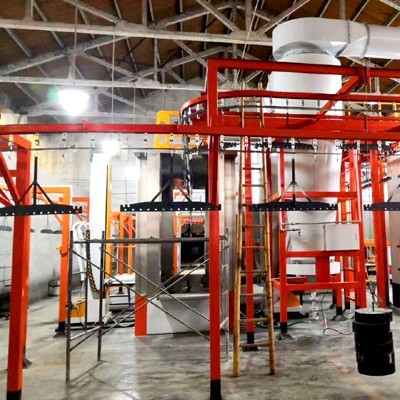 五金噴粉生產(chǎn)線工藝流程主要由前處理、脫水、噴粉/噴油、固化烘干等。涂裝生產(chǎn)線輸送系統(tǒng)采用懸掛式或地面滑橇相結(jié)合的機(jī)械化輸送方式,運(yùn)行平穩(wěn)、快速便捷并且可以提高工業(yè)產(chǎn)量;采用PLC可控編程,根據(jù)生產(chǎn)工藝的實(shí)際要求編程控制。