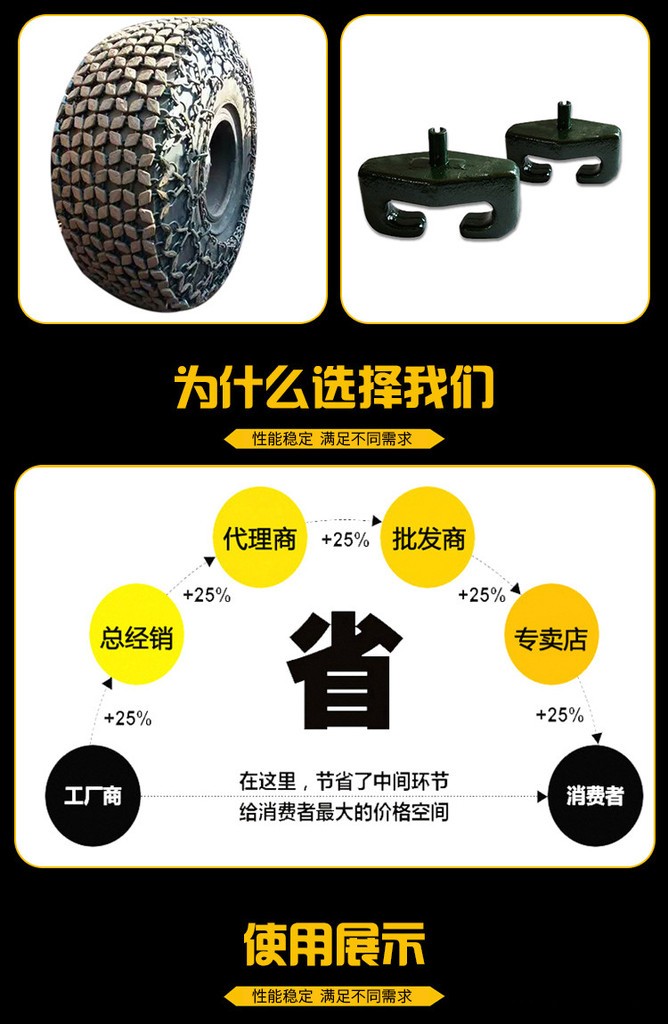 天津天威金屬制品有限公司是一家專注于輪胎保護(hù)鏈產(chǎn)品研發(fā)、生產(chǎn)、銷售的企業(yè),坐落于天津市靜海區(qū)。公司注重技術(shù)進(jìn)步,科學(xué)管理,形成了以技術(shù)、品牌、質(zhì)量、服務(wù)為核心的優(yōu)勢(shì)。公司自成立以來(lái),始終堅(jiān)持以人才為本、誠(chéng)信立業(yè)的經(jīng)營(yíng)原則,薈萃業(yè)界精英,將國(guó)內(nèi)外先進(jìn)的技術(shù)、管理方法及企業(yè)經(jīng)驗(yàn)與具體實(shí)際相結(jié)合,為提高采礦設(shè)備輪胎的工作效率,延長(zhǎng)輪胎使用壽命,提供了科學(xué)合理的解決方案,極大降低了頻繁更換輪胎的高額費(fèi)用,滿足了用戶的需求,提高了經(jīng)濟(jì)效益,從而得到了廣泛認(rèn)可和一致好評(píng)。公司恪守務(wù)實(shí)原則,生產(chǎn)**產(chǎn)品,以管理促效益,以質(zhì)量求生存,以誠(chéng)信贏市場(chǎng),產(chǎn)品遠(yuǎn)銷海內(nèi)外。歡迎各界人士前來(lái)公司參觀、洽談,希望成為您信賴的長(zhǎng)期合作伙伴。