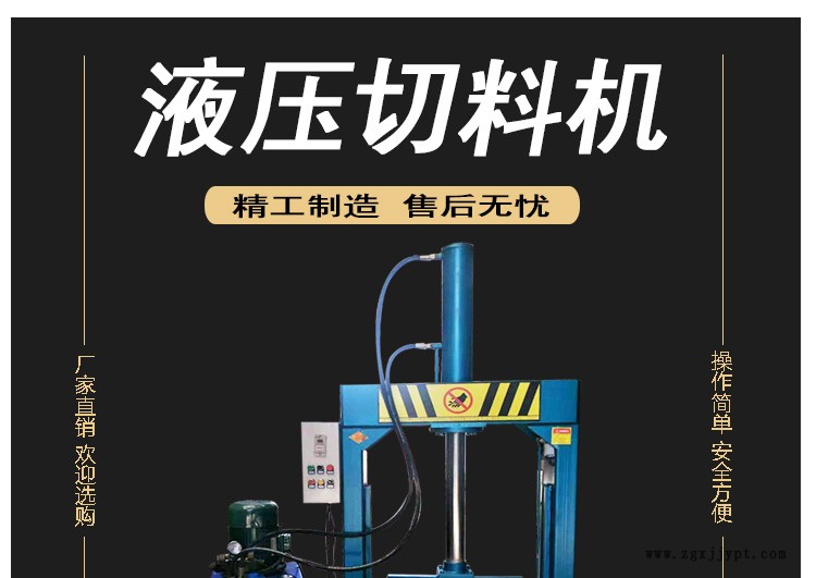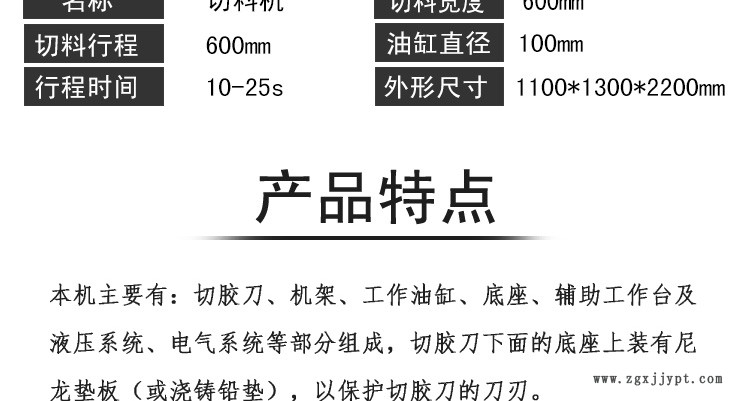 本機(jī)主要有切膠刀、機(jī)架、工作油缸、底座、輔助工作臺(tái)及液壓系統(tǒng)、電氣系統(tǒng)等部分組成,切膠刀下面的底座上裝有尼龍橡膠墊板,以保護(hù)切膠刀的刀刃。