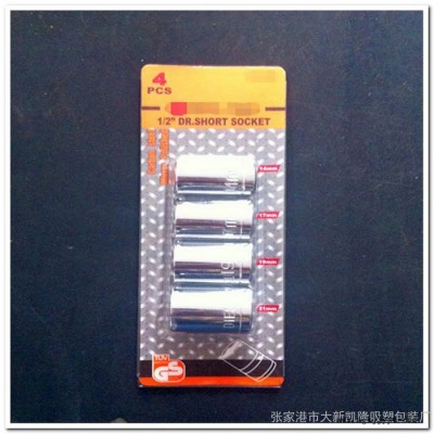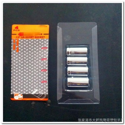 江蘇張家港大新凱隆吸塑專業(yè)生產(chǎn)各類PVC、PS、PET吸塑泡殼、托盤產(chǎn)品,其中如圖所示PVC吸塑泡殼(整體插卡式:長19.1cm,寬7.1cm)適用于4件套外貿(mào)套筒(套筒規(guī)格:14mm、17mm、19mm、21mm)工具包裝:美觀牢固、耐存放,產(chǎn)品是為江浙滬地區(qū)五金工具制造廠家及工具商貿(mào)公司配套吸塑包裝。