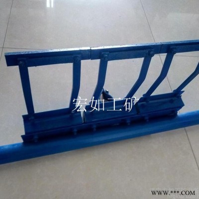 P型合金橡膠清掃器安裝于頭輪附近平穩(wěn)工作面處。用于清除頭輪下方附近的粘附物料適,屬于二道清掃器。利用橡膠體本身的彈性性能,可自動(dòng)調(diào)節(jié)清掃器刮板與輸送機(jī)膠帶之間的接觸壓力,保證了刮板與運(yùn)行的膠帶受力在一定合適的范圍之內(nèi),使清料既干凈,又不損壞膠帶。
