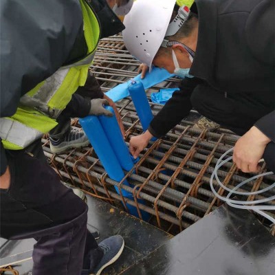 為什么應(yīng)用氣囊來攔茬呢。大家都知道,氣囊是一種充氣膨脹、放氣收縮的氣袋,在不充氣狀態(tài)下可以塞入很小的鋼筋縫隙中,充氣后膨脹又可以很好的填充混凝土構(gòu)件內(nèi)部空間,幾個(gè)連成一排的氣囊相互擠壓形成一個(gè)很完整的攔茬截面,阻斷高標(biāo)號(hào)混凝土向另一側(cè)流竄的路徑。氣囊放氣后收縮,直接拔出簡單清洗即可再次投入使用。