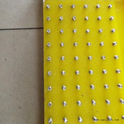 油田鉆井平臺(tái)防滑板的工作原理是將直徑4mm的鋼釘壓鑄在橡膠中,其中橡膠板厚30mm,鋼釘露出板面5mm,鋼釘間的距離分布更加合理,當(dāng)操作工人踩上后,總有30枚鋼釘突出腳底感覺(jué)舒適,起到防滑作用,橡膠板底面有2mm的凸臺(tái)起到了兩面防滑。