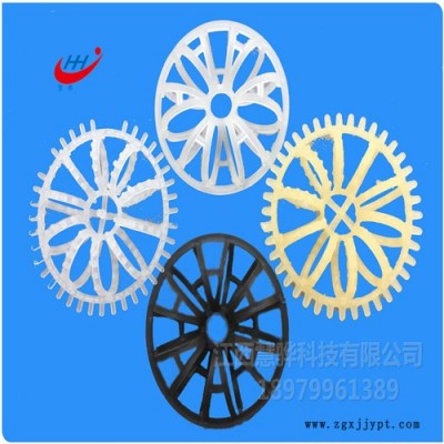 塑料花環(huán)又稱塑料泰勒花環(huán),是由12個小圓環(huán)按徑向排列而組成的一個大扁球體。由于塑料花環(huán)的空隙處能有較高的持液量,可使塔內(nèi)液體的停留時間較長,從而增加了氣液兩相的接觸時間,提高了填料的傳質(zhì)效率。