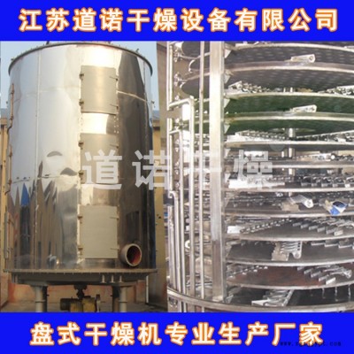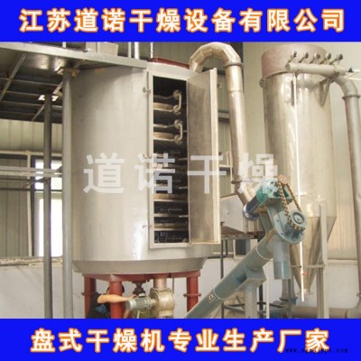 濕物料自加料器連續(xù)地加到干燥器上部 層干燥盤上,帶有耙葉的耙臂作回轉(zhuǎn)運(yùn)動使耙臂作回轉(zhuǎn)運(yùn)動使耙葉連續(xù)地翻抄物料。物料沿指數(shù)螺旋線流過干燥盤表面,在小干燥盤上的物料被移送到外緣,并在外緣落到下方的大干燥盤外緣,在大干盤上物料向里移動并從中間落料口落如下一層小干燥盤中。大小干燥盤上下交替排列,物料得以連續(xù)地流過整個干燥器。中空的干燥盤內(nèi)通入加熱介質(zhì),加熱介質(zhì)形式有飽和蒸汽、熱水和導(dǎo)熱油,加熱介質(zhì)由干燥盤的一端進(jìn)入,從另一端導(dǎo)出。已干物料從后一層干燥盤落到殼體的底層,后被耙葉移送到出料口排出。濕份從物料中逸出,由設(shè)在頂蓋上的排濕口排出,真空型盤式干燥器的濕氣由設(shè)在頂蓋上的真空泵口排出。從底層排出的干物料可直接包裝。通過配加翅片加熱器、溶劑回收冷凝器、袋式除塵器、干料返混機(jī)構(gòu)、引風(fēng)機(jī)等輔機(jī),可提高其干燥的生產(chǎn)能力,干燥膏糊狀和熱敏性物 料,可方便地回收溶劑,并能進(jìn)行熱解和反應(yīng)操作。