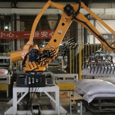 碼垛機械手主要由機械主體、伺服驅(qū)動系統(tǒng)、手臂機構(gòu)、末端執(zhí)行器(抓手)、末端執(zhí)行器調(diào)節(jié)機構(gòu)以及檢測機構(gòu)組成,按不同的物料包裝、堆垛順序、層數(shù)等要求進行參數(shù)設置,實現(xiàn)不同類型包裝物料的碼垛作業(yè)。按功能劃分為進袋、轉(zhuǎn)向、排袋、編組、抓袋碼垛、托盤庫、托盤輸送以及相應的控制系統(tǒng)等機構(gòu)。
